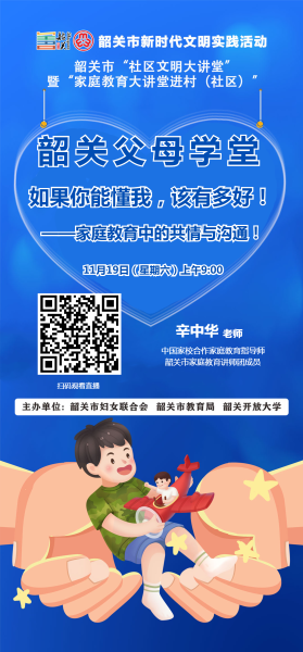 《父母学堂》第四十五期将邀请韶关市家庭教育讲师团成员辛中华老师,以“如果你能懂我,该有多好”为主题,聚焦家庭教育中的共情与沟通,给广大家长传送亲子沟通经验,具有很强的实操性。