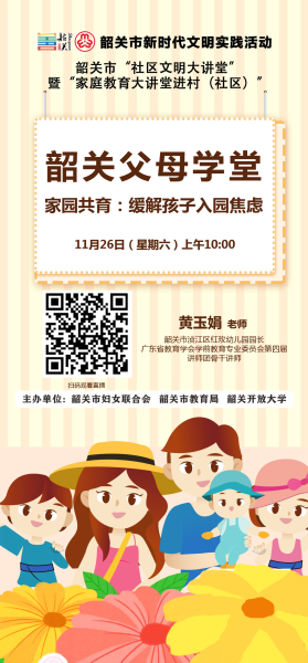 《父母学堂》第四十六期将邀请韶关市浈江区红玫幼儿园 黄玉娟 园长,以“家园共育:缓解孩子入园焦虑”为主题,从新入园幼儿不适应的现象、分离焦虑的主要症状、新生入园的十三忌、如何应对孩子的入园焦虑以及新生家长须知等方面展开阐述,给予家长有针对性的引导,缓解幼儿入园焦虑。
