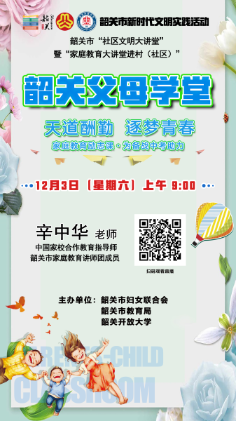 《父母学堂》第四十七期将邀请韶关市家庭教育讲师团成员辛中华老师,以“天道酬勤 逐梦青春——家庭教育励志课·为备战中考助力”为主题,从家庭学习中的学习习惯、学习环境、学习效率等方面阐述家长在孩子备战中考过程中发挥的重要作用,鼓励中考学生一份耕耘、一份收获,努力学习、报效祖国。