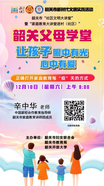 《父母学堂》第四十八期将邀请韶关市家庭教育讲师团成员辛中华老师,以“让孩子眼中有光、心中有爱——正确打开家庭教育每“疫”天的方式”为主题,从家庭教育层面阐述如何准确把握和执行疫情防控措施,保持良好心态,提升解决问题的能力等,过好每一个当下。