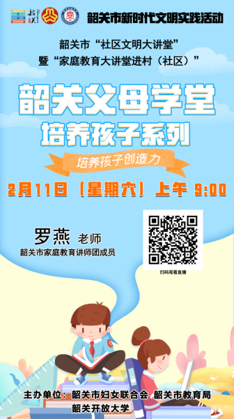 《父母学堂》第五十三期将邀请到韶关市家庭教育讲师团成员罗燕授课,课程主题是培养孩子系列《培养孩子创造力》与家长一起探讨创造力对孩子的重要性,以及如何培养孩子的创造力。