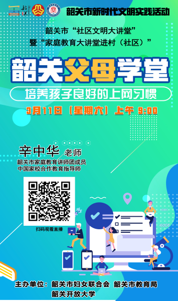 《父母学堂》第五十七期将邀请到韶关市家庭教育讲师团成员辛中华授课,课程主题是《培养孩子良好的上网习惯》带领大家一起全面认识互联网,与家长探讨互联网对孩子教育带来的正面影响和负面影响,并教大家应该如何正确利用互联网。