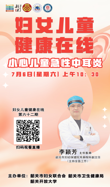 为学习宣传贯彻党的二十大精神,认真学习贯彻习近平总书记关于健康中国建设的重要论述,认真落实全国妇联、省妇联和市委市政府关于家庭健康工作的有关部署要求,以提高妇女儿童健康水平、促进妇女儿童全面发展为主要目标,市妇女联合会、市卫生健康局、韶关开放大学联合创办了韶关市《妇女儿童健康在线》线上直播栏目,以线上直播方式邀请市内专家名师开展妇女儿童健康讲座,逢周六上午开播。课程主要围绕妇女与儿童健康方面的知识进行科普。