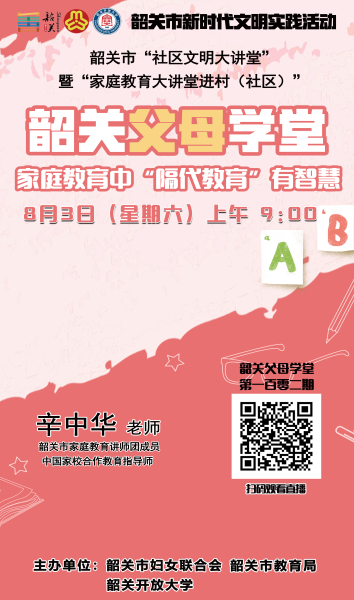 本期《父母学堂》邀请到韶关市家庭教育讲师团成员、中国家校合作教育指导师辛中华老师进行授课,给家长们带来《家庭教育中“隔代教育”有智慧》相关课程,为广大家长答疑解惑。