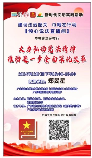 为深入学习贯彻习近平新时代中国特色社会主义思想,大力加强宪法宣传教育,在全社会营造尊崇宪法、学习宪法、遵守宪法、维护宪法、运用宪法的良好氛围。在12月4日国家宪法日当天,韶关市妇联、韶关市普法办公室、韶关开放大学联合主办的倾心说法直播间平台第38期,将邀请广东天行健律师事务所郑旻星律师带领大家学习《中华人民共和国宪法》,帮助群众了解我国的宪法,以及宪法是如何保障妇女儿童合法权益等,欢迎广大群众观看!