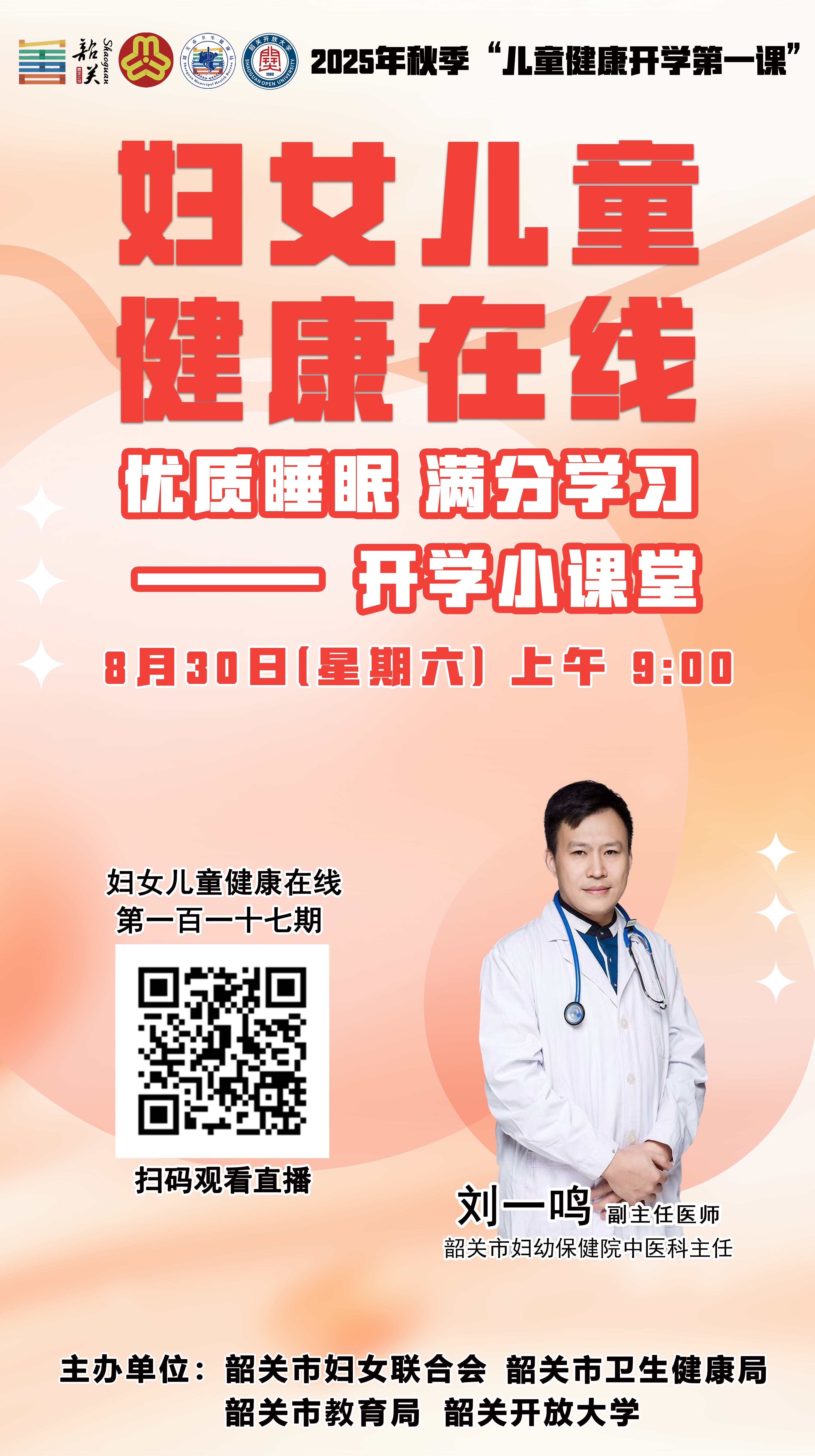 金秋送爽,新学期伊始,孩子们重返校园。儿童和青少年的健康成长连接着家庭的幸福,更关系祖国的美好未来。为帮助儿童青少年养成健康生活方式,扣好新学期“第一粒扣子”,市卫生健康局、市教育局、市妇联和韶关开放大学将联合于8月30-31日和9月6-7日分期在《妇女儿童健康在线》直播栏目开展2025年秋季“儿童健康开学第一课”讲座活动,为广大家长和朋友带来一场关于儿童健康知识盛宴,为新学期的健康保驾护航。