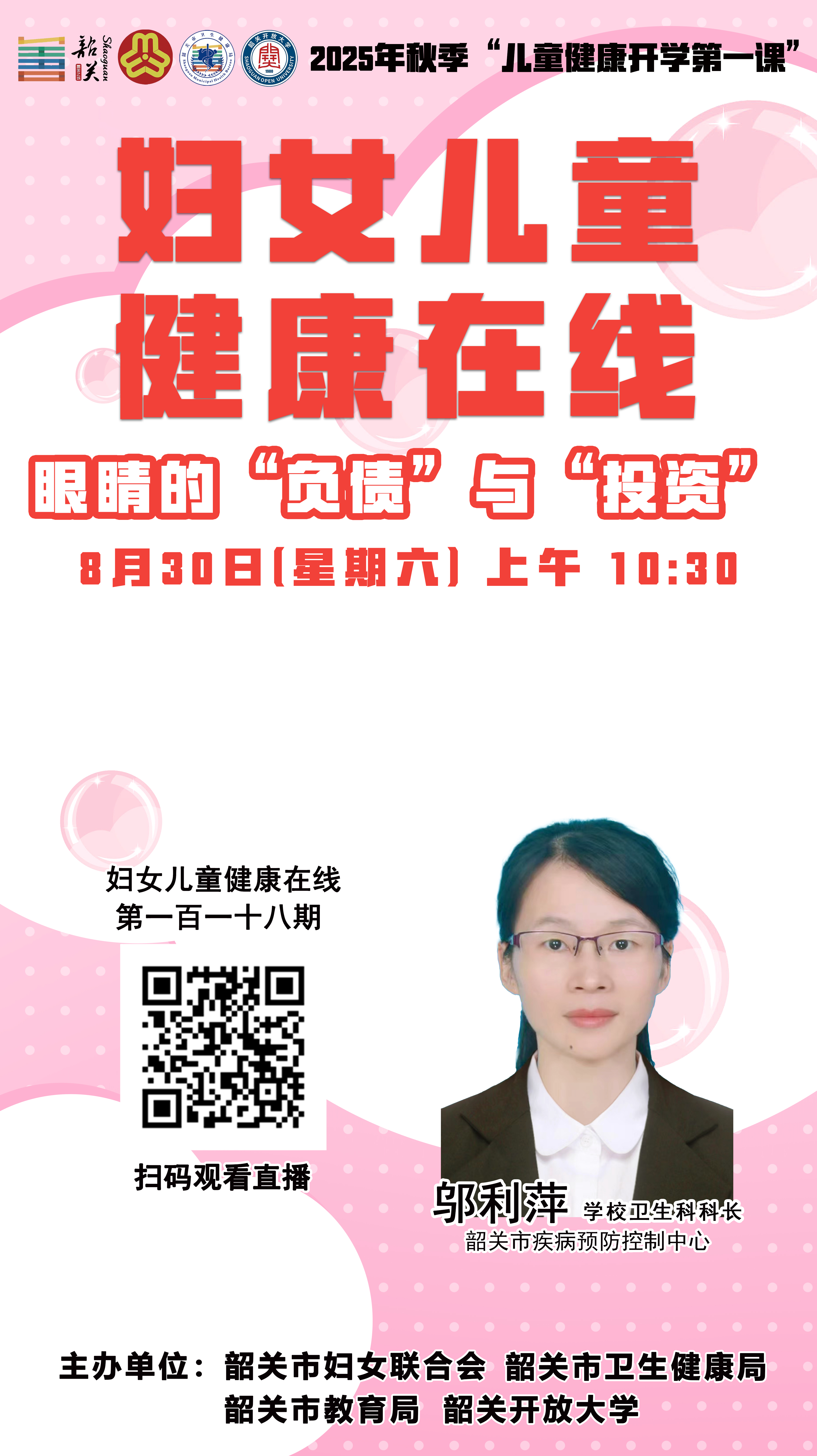 金秋送爽,新学期伊始,孩子们重返校园。儿童和青少年的健康成长连接着家庭的幸福,更关系祖国的美好未来。为帮助儿童青少年养成健康生活方式,扣好新学期“第一粒扣子”,市卫生健康局、市教育局、市妇联和韶关开放大学将联合于8月30-31日和9月6-7日分期在《妇女儿童健康在线》直播栏目开展2025年秋季“儿童健康开学第一课”讲座活动,为广大家长和朋友带来一场关于儿童健康知识盛宴,为新学期的健康保驾护航。