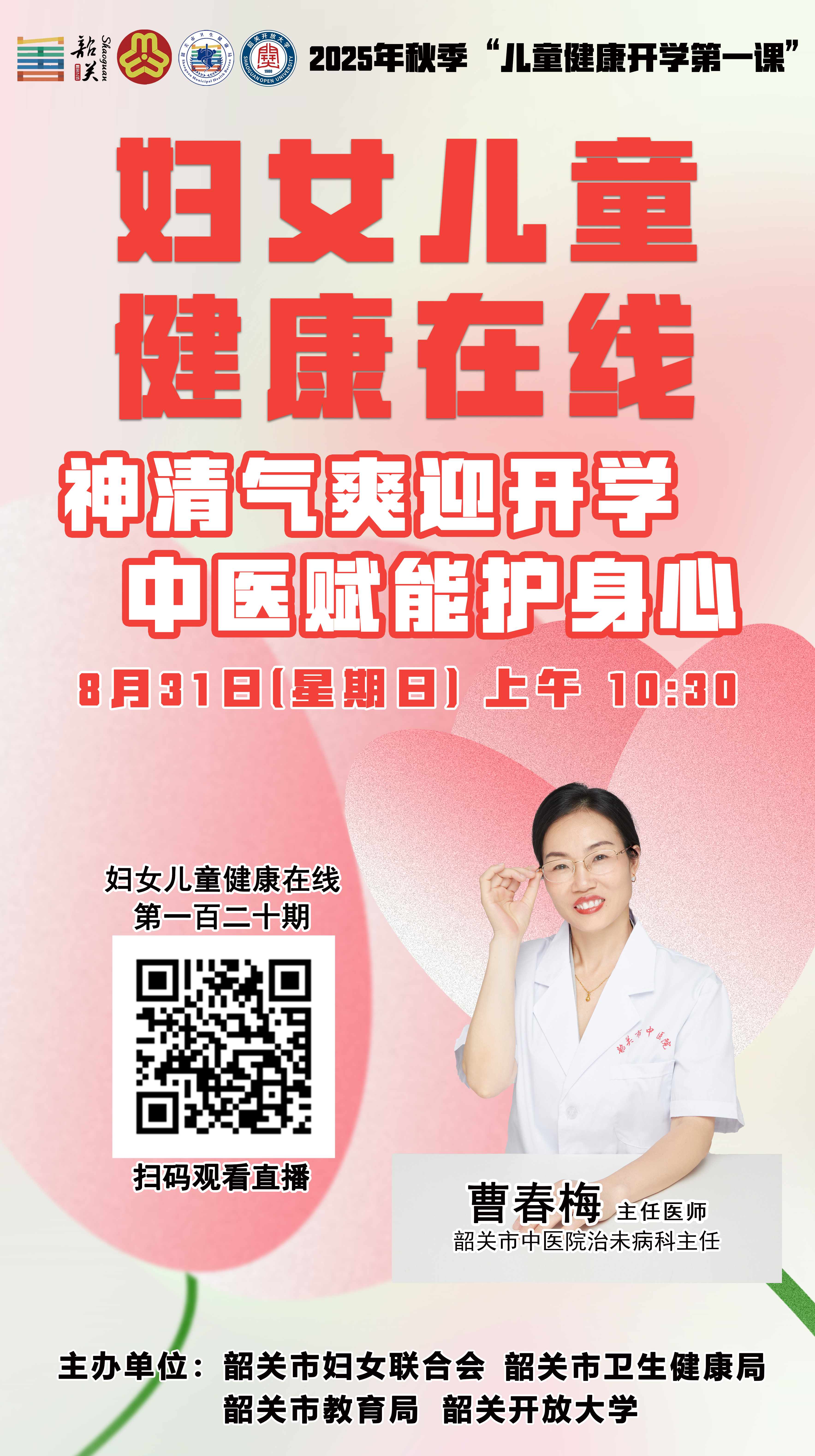 金秋送爽,新学期伊始,孩子们重返校园。儿童和青少年的健康成长连接着家庭的幸福,更关系祖国的美好未来。为帮助儿童青少年养成健康生活方式,扣好新学期“第一粒扣子”,市卫生健康局、市教育局、市妇联和韶关开放大学将联合于8月30-31日和9月6-7日分期在《妇女儿童健康在线》直播栏目开展2025年秋季“儿童健康开学第一课”讲座活动,为广大家长和朋友带来一场关于儿童健康知识盛宴,为新学期的健康保驾护航。