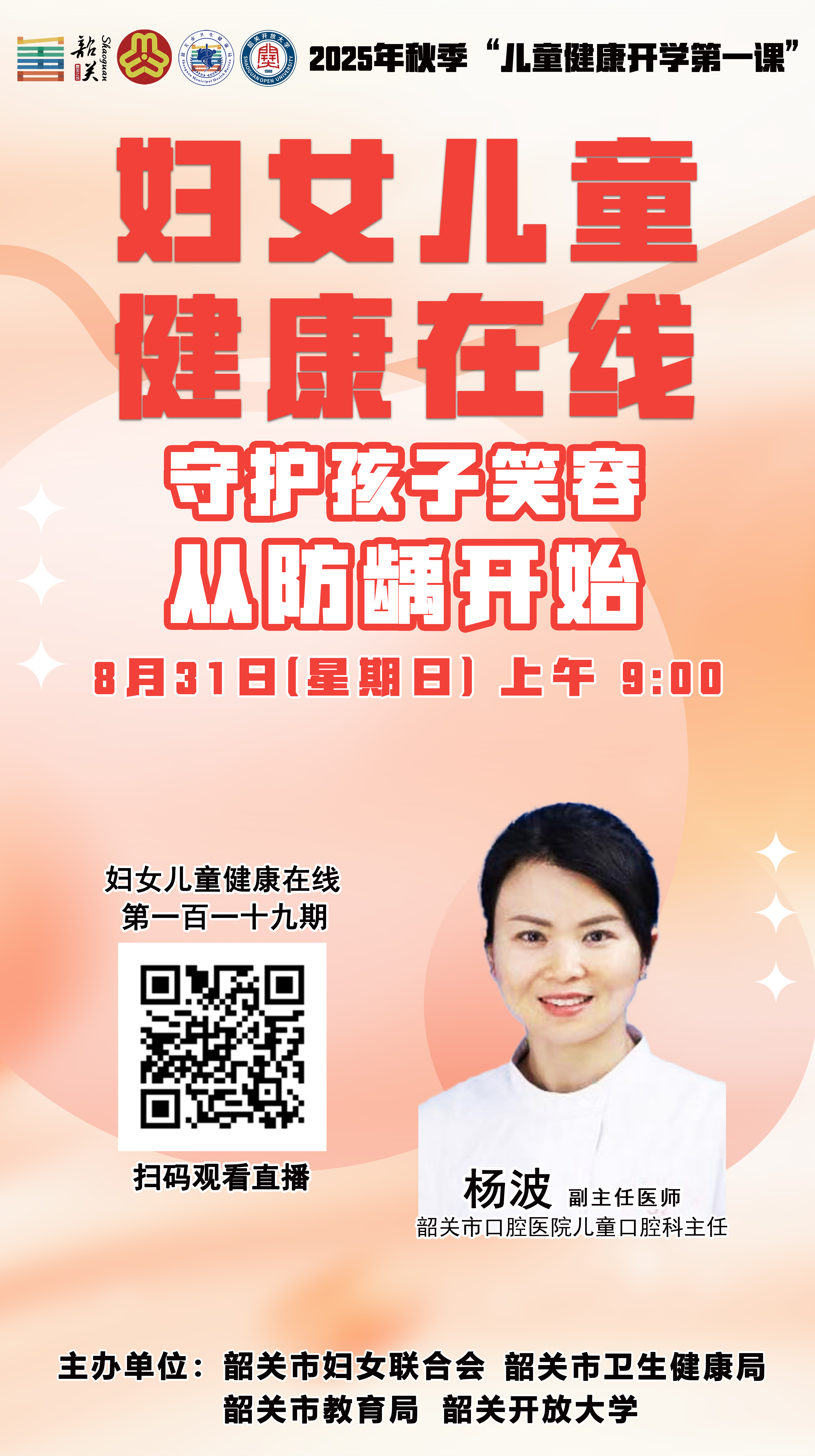 金秋送爽,新学期伊始,孩子们重返校园。儿童和青少年的健康成长连接着家庭的幸福,更关系祖国的美好未来。为帮助儿童青少年养成健康生活方式,扣好新学期“第一粒扣子”,市卫生健康局、市教育局、市妇联和韶关开放大学将联合于8月30-31日和9月6-7日分期在《妇女儿童健康在线》直播栏目开展2025年秋季“儿童健康开学第一课”讲座活动,为广大家长和朋友带来一场关于儿童健康知识盛宴,为新学期的健康保驾护航。