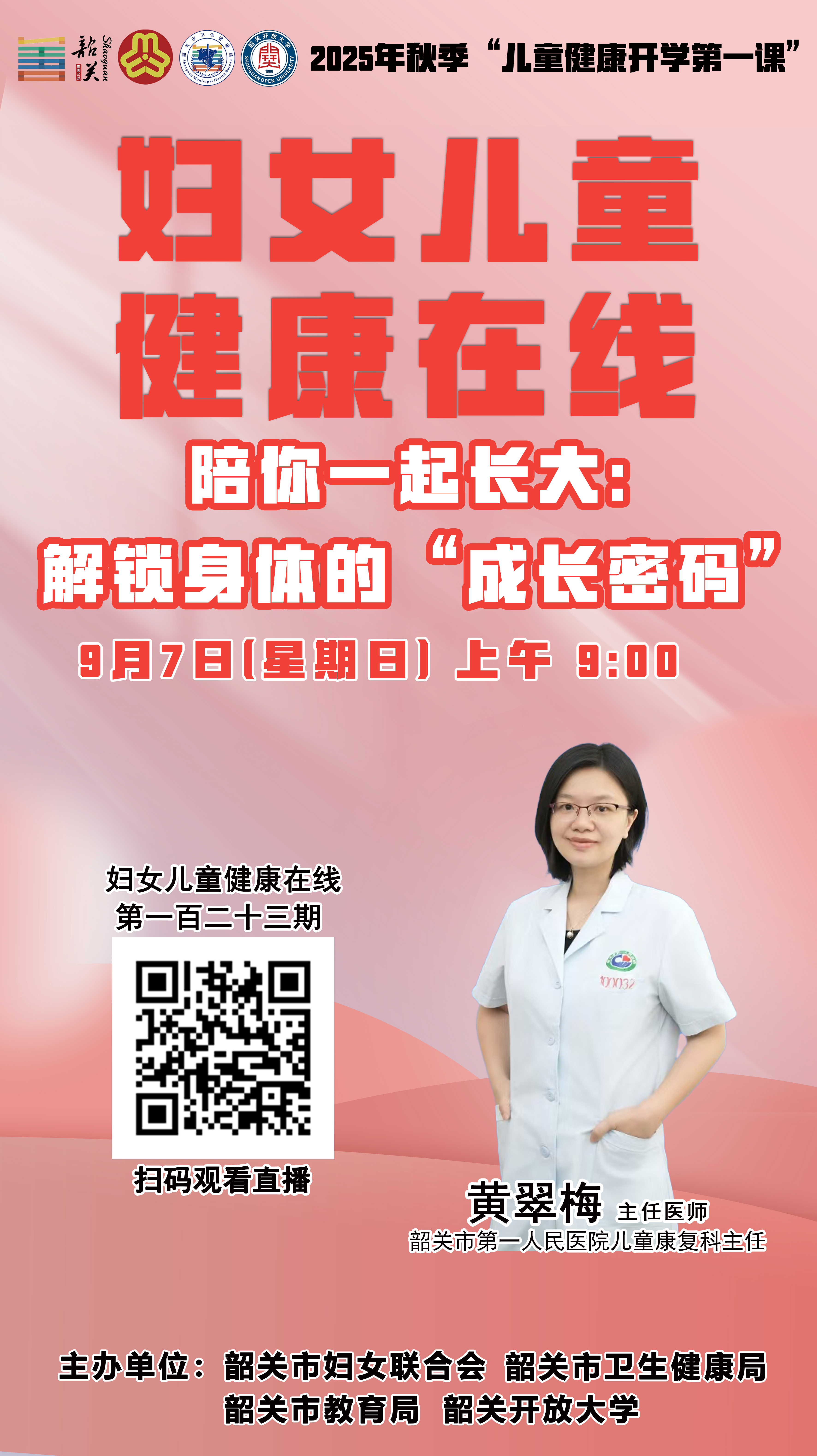 金秋送爽,新学期伊始,孩子们重返校园。儿童和青少年的健康成长连接着家庭的幸福,更关系祖国的美好未来。为帮助儿童青少年养成健康生活方式,扣好新学期的“第一粒扣子”,市卫生健康局、市教育局、市妇联和韶关开放大学将联合于8月30-31日和9月6-7日分期在《妇女儿童健康在线》直播栏目开展2025年秋季“儿童健康开学第一课”讲座活动,为广大家长和朋友带来一场关于儿童健康知识盛宴,为新学期的健康保驾护航。