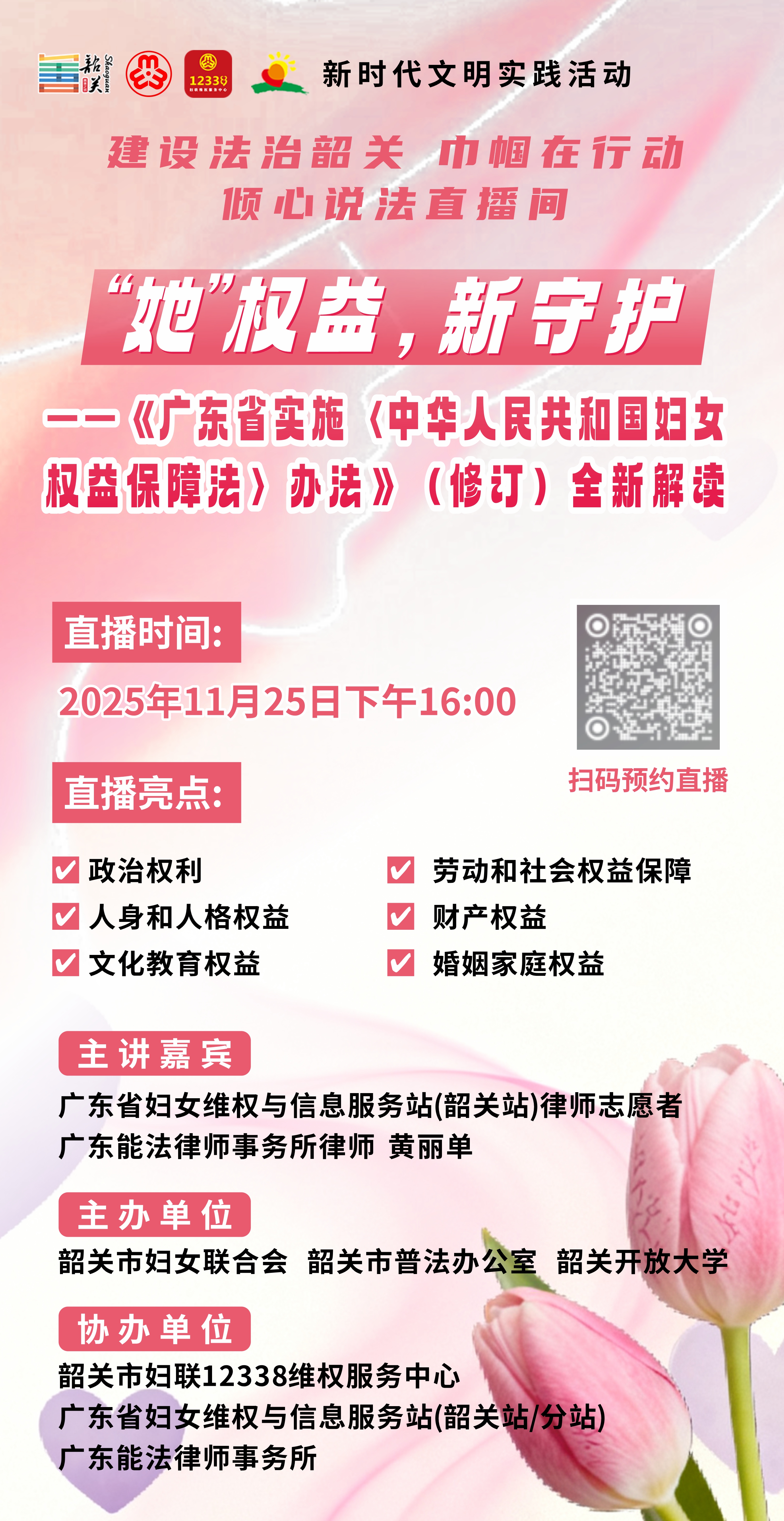 本次直播由广东省妇女维权与信息服务站(韶关站)律师志愿者、广东能法律师事务所黄丽单律师开讲!全程围绕“重点条款”展开。不仅帮你划清新规中的“权益红线”与“保障范围”,更会结合真实案例解读,同步分享维权举证技巧与求助渠道,让你从容应对各类权益问题!