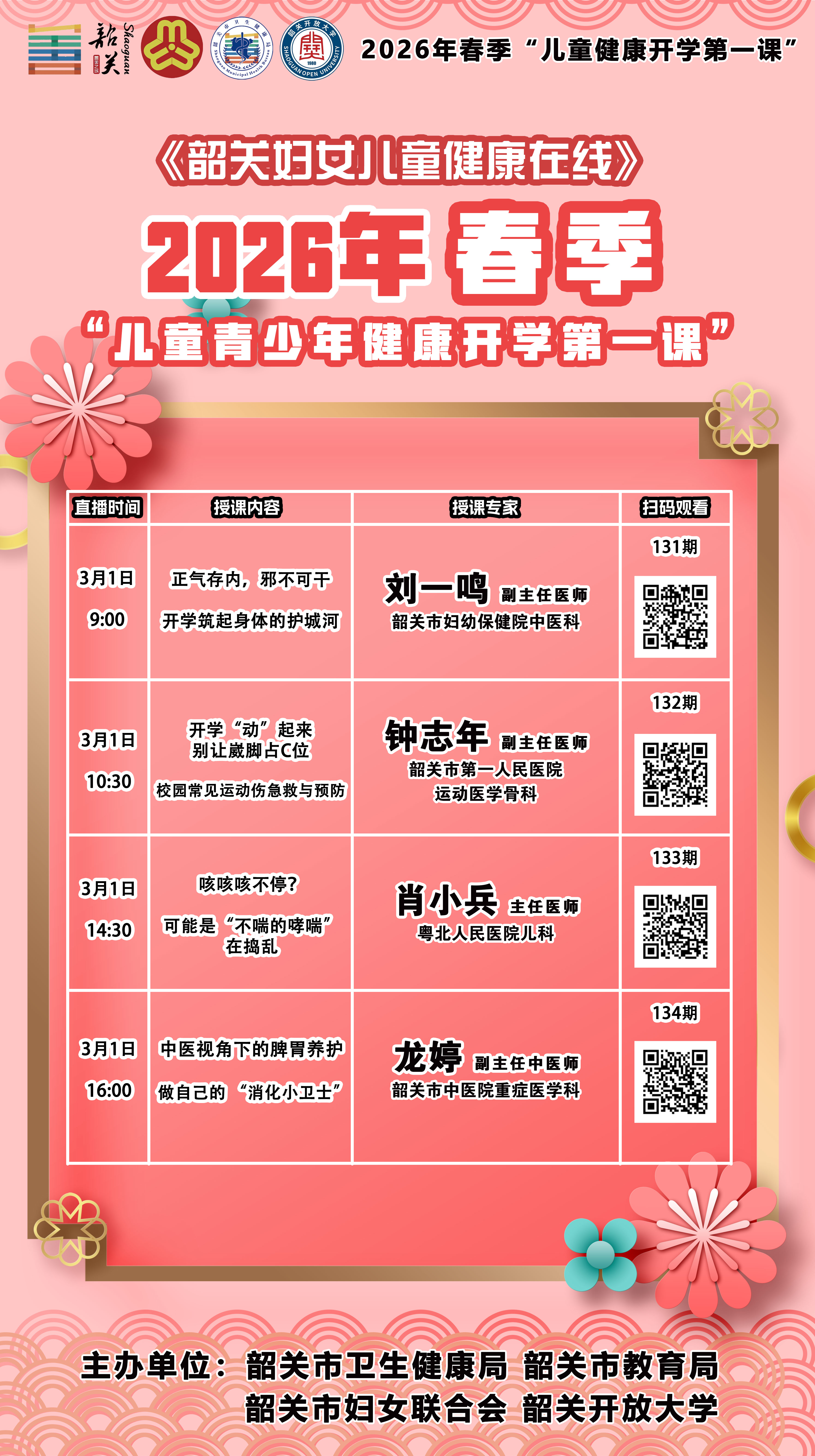 春意盎然,新学期启航,孩子们重返校园。儿童和青少年的健康成长连接着家庭的幸福,更关系祖国的美好未来。为帮助儿童青少年养成健康生活方式,扣好新学期的 “第一颗纽扣”,市卫生健康局、市教育局、市妇联和韶关开放大学将联合于3月1日全天分时间段在《妇女儿童健康在线》直播栏目开展2026年春季 “儿童健康开学第一课”讲座活动,为广大家长和朋友带来一场儿童健康知识盛宴,为新学期的健康保驾护航。